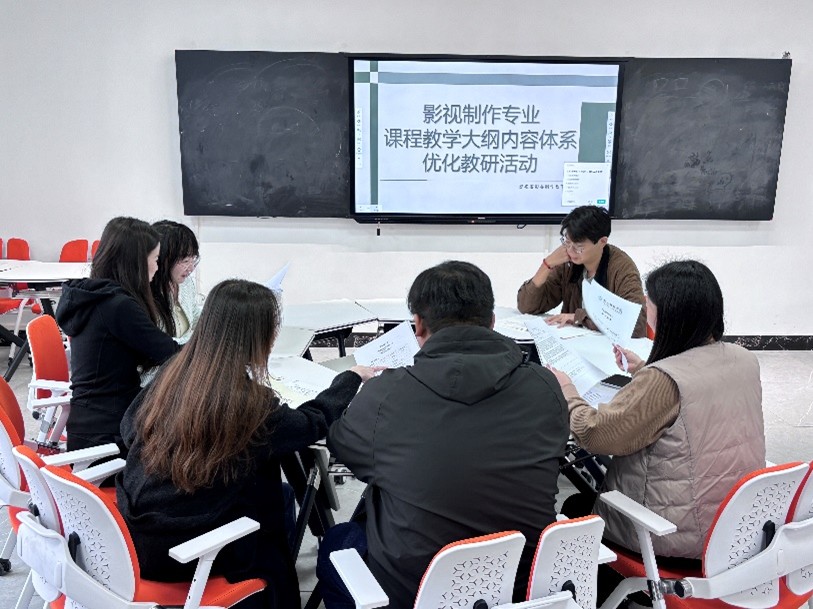 活动伊始,郭老师围绕当前影视行业发展趋势与人才需求变化,阐述了优化教学大纲的必要性。她指出,随着数字技术在影视领域的广泛应用,短视频制作、虚拟制片、AI 辅助创作等新兴方向对人才能力提出了新要求,现有教学大纲需及时补充相关内容,同时强化实践教学模块,确保学生毕业后能快速适应岗位需求。随后,各课程负责人分别就《摄影与摄像基础》《数字剪辑》《脚本设计》《影视创作》等核心课程的教学大纲进行汇报,详细介绍了课程目标、教学内容模块、学时分配、考核方式等关键信息,并结合过往教学过程中发现的问题,提出了大纲修订的初步设想。