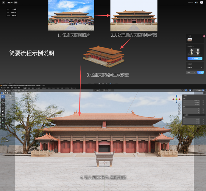 为提升课堂效率与学生的创作能力,课程特别引入了AI 生成式模型技术的应用。这一技术是通过用户上传的参考图来在线生成具有贴图的模型,在最近的几个月内,此项技术有了较为成熟的发展。教师通过演示如何利用AI生成带贴图的建筑等等三维资产,让学生能够在较短时间内完成场景基础元素的搭建。这样的方式不仅大幅提升了建模效率,也让学生得以将更多精力投入到视觉叙事、结构逻辑与文化表达的思考中,从而实现“技术提升 × 创意深化”的双向促进。