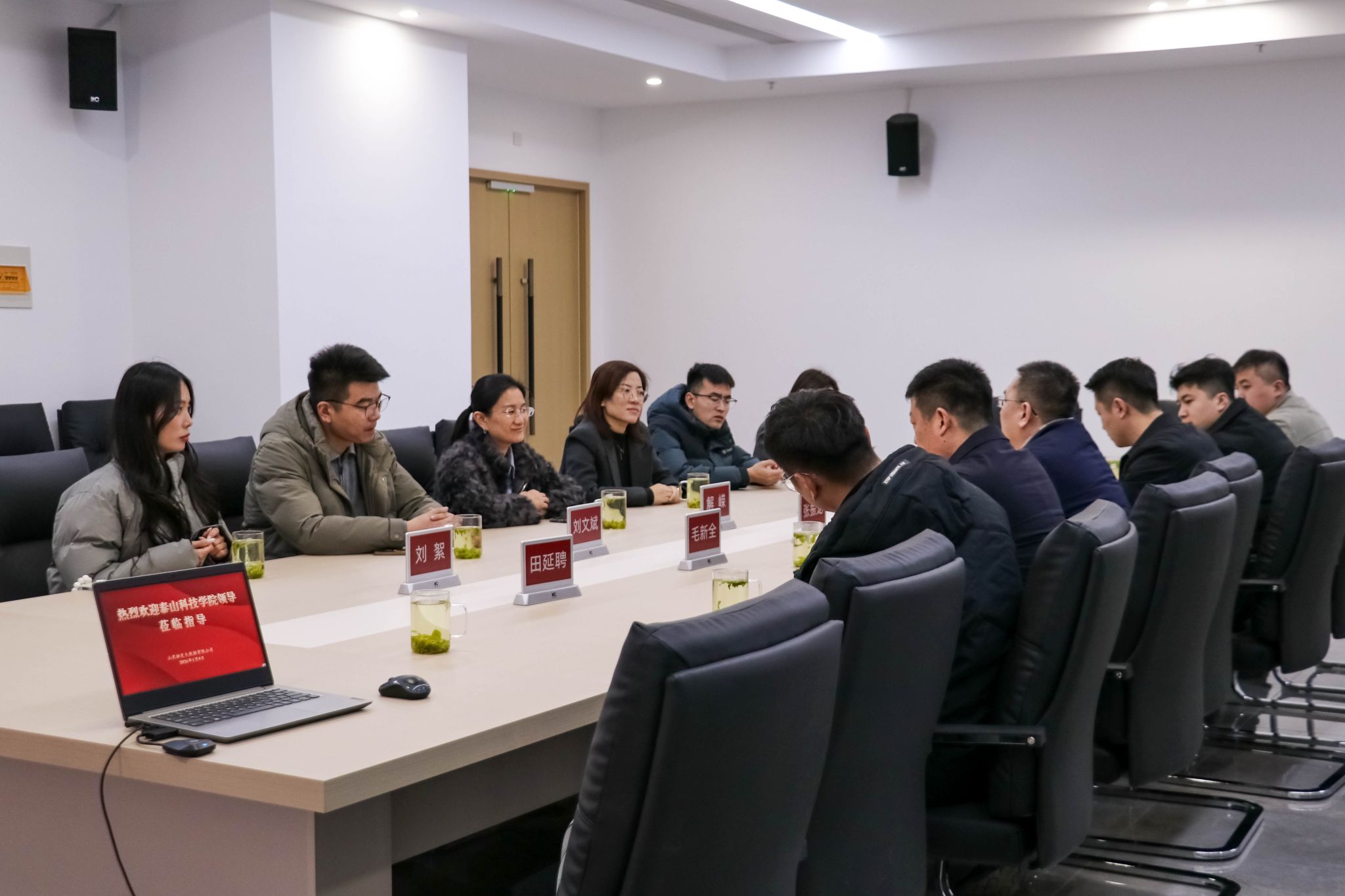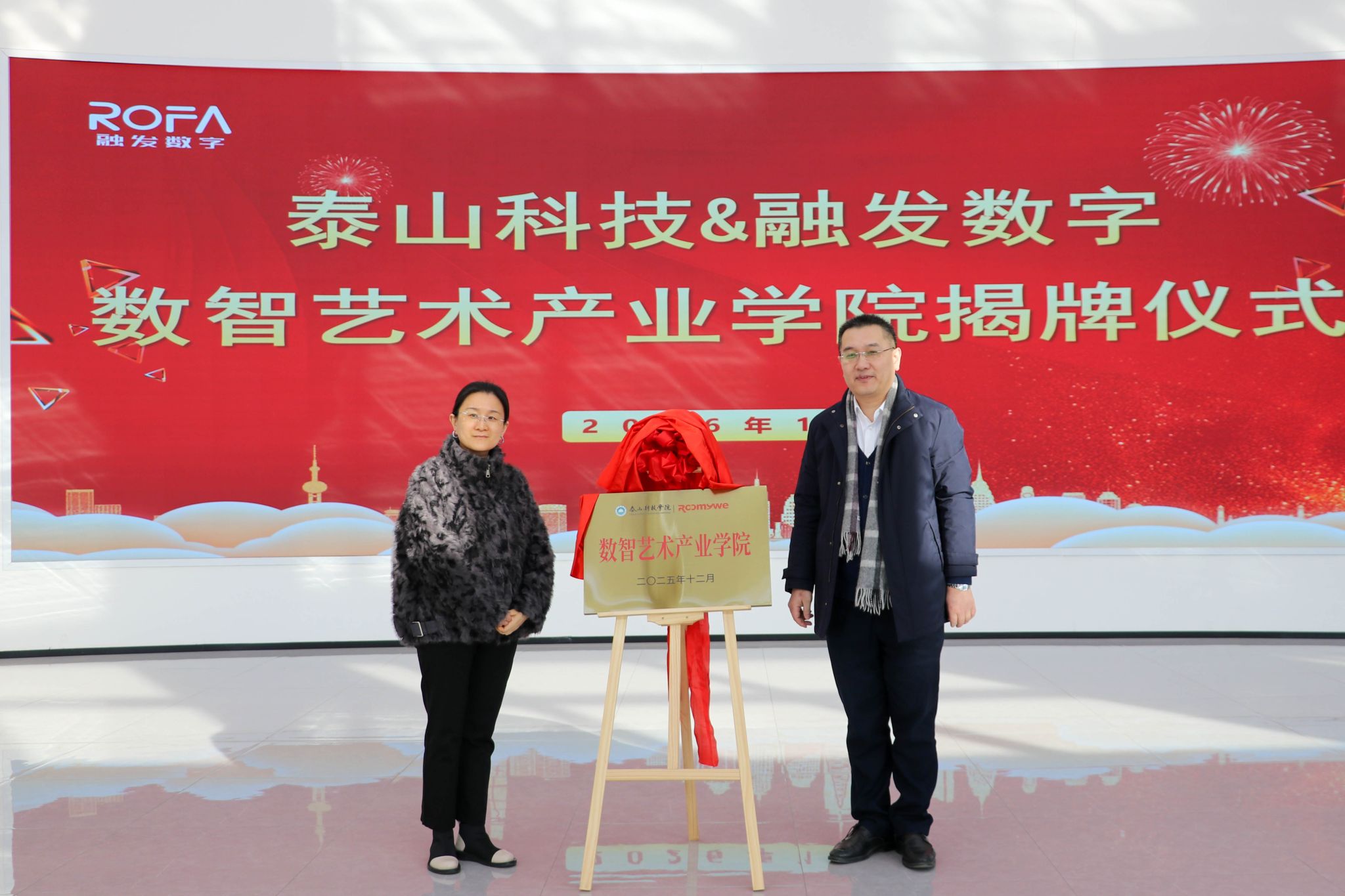 张振龙与解嵘共同为“数智艺术产业学院”揭牌。张振龙代表企业致辞,强调了产教融合对区域经济发展的重要性,对产业学院成立表示祝贺,并介绍了未来的支持政策与发展期望。泰山科技学院校长助理解嵘代表学校讲话,介绍了学校发展历程、办学特色、专业建设成果,表达了对产业学院未来发展的规划与期许。山东融发数字运营有限公司项目经理李伟成随后汇报了园区管培生培养情况。最后,参会人员围绕产业学院运营模式、人才培养、校企资源共享机制、后期双方联动等议题开展座谈交流。