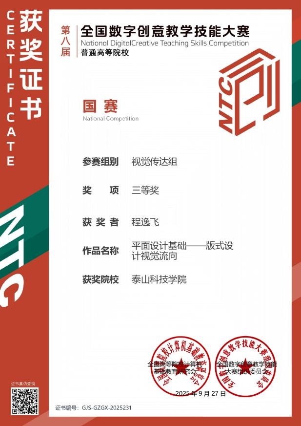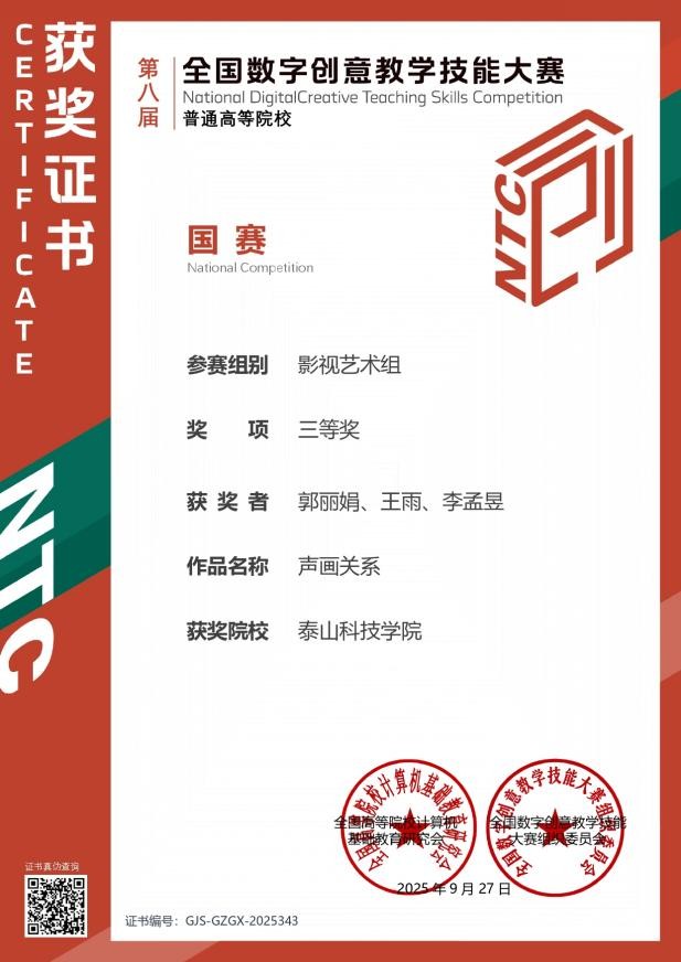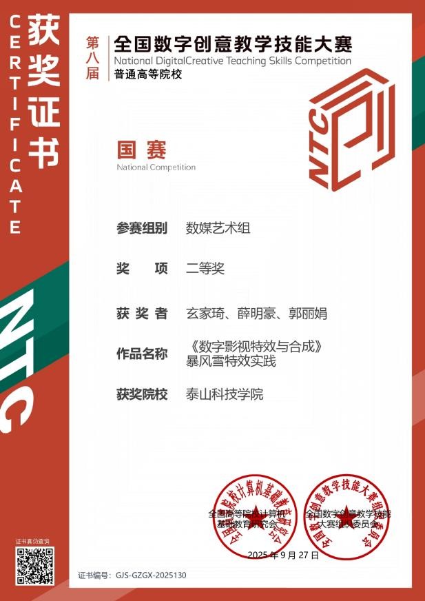 9月28日,第八届全国数字创意教学技能大赛(NCDCTS)全国总决赛在长沙理工大学圆满落幕。泰山科技学院艺术传媒学院6支教师团队作品表现优异,从全国574所高校的4581件参赛作品中脱颖而出,成功入围国赛,最终荣获二等奖2项、三等奖4项。