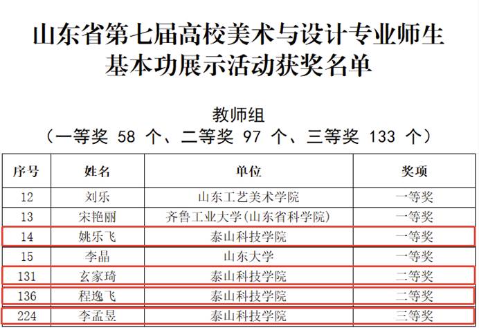 近日,由山东省教育厅、山东省美术家协会联合主办的山东省第七届高校美术与设计专业师生基本功展示活动获奖名单正式公布。据悉,本次全省参赛高校共102所,参赛师生达1078人。泰山科技学院艺术传媒学院师生凭借深厚的专业积淀、扎实的创作功底与鲜明的创新表达脱颖而出,斩获多项殊荣:我院教师姚乐飞获得教师组一等奖,玄家琦、程逸飞获得教师组二等奖,李孟昱获得教师组三等奖,周孟陶获得学生单项组一等奖、王硕硕、张晨宇、梁传婷获得学生单项组三等奖,师生合计揽获8项省级奖项,充分彰显了学院在美术与设计类人才培养中的扎实成效。